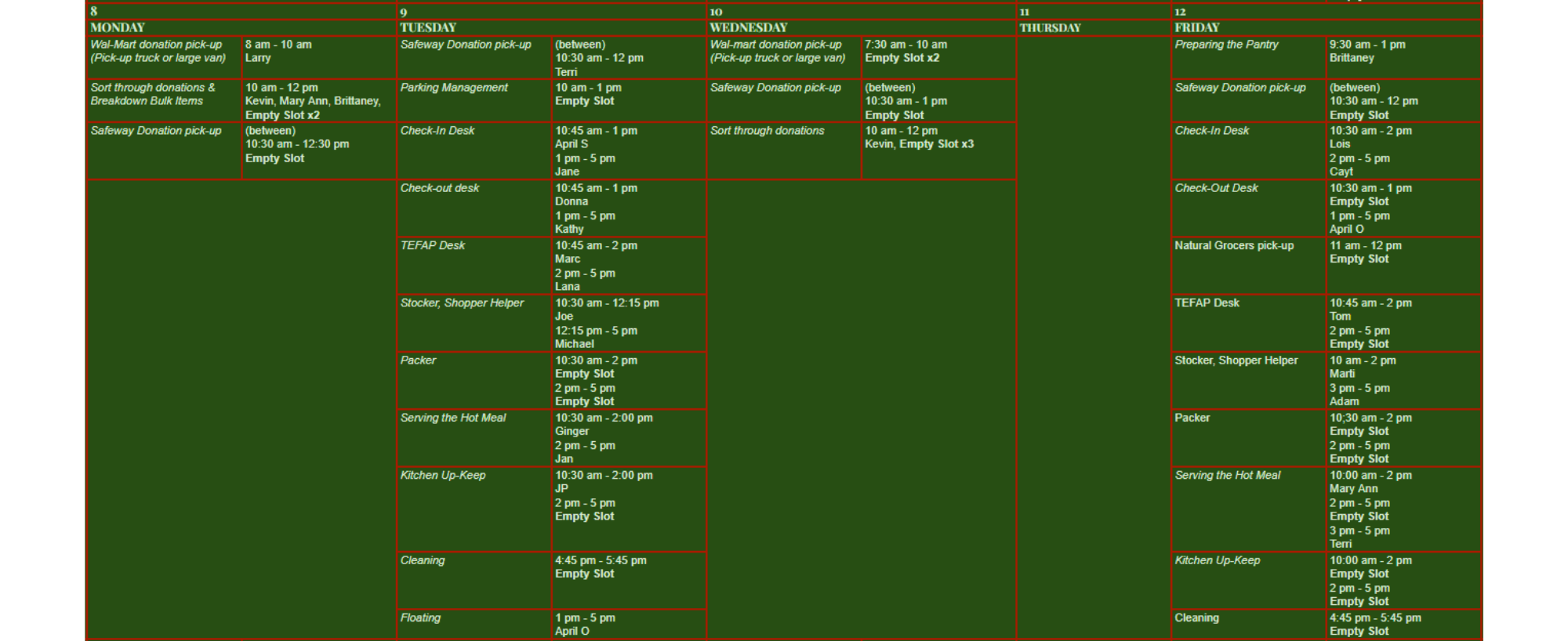 The sign-up for prepping the holiday hot meal is with the December sign-up. Last month, we served nearly 200 hot meals for the Thanksgiving pantry.